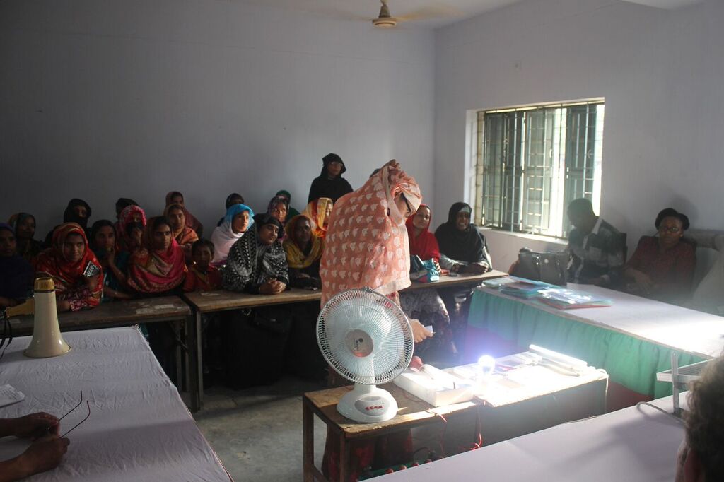 Modhukhali village in Bangladesh-  Here is Shahana Begama in a classroom, speaking to 20 women. The women are listening deeply. On a table, one can see various components: a solar system, a bulb, a solar panel, a control panel, battery…These tools are used by Mrs Begama during a training. Today, she explains how to use the  Solar Home System ( SHS), a cheap and a simple solar equipment. It provides electricity to poor family. The aim of the training is to assure families that they can have access to energy easily  . The training programme helps also families to used  solar systems. It creates a positive social force in the village as it promotes renewable energies technologies.