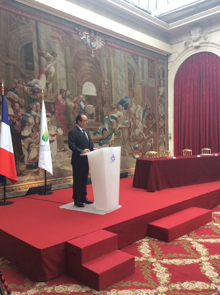 Six mois mois après avoir accueilli la 21e session de la conférence des parties à la convention-cadre des Nations unies sur les changements climatiques  ( COP 21) au Bourget et après l’adoption de l’Accord sur le climat le 12 décembre 2015, le Président de la République française, François Hollande, a signé la loi de ratification de l’Accord de Paris, lors d’une cérémonie à Paris. De nombreuses personnes ont assisté à cette cérémonie:ONG, représentants d’entreprises, dirigeants de groupes engagés dans la transition énergétique, ambassadeur de l’Union Européenne, celui du Pérou ( qui a présidé la COP 20) et celui du Maroc ( qui présidera la COP 22)..